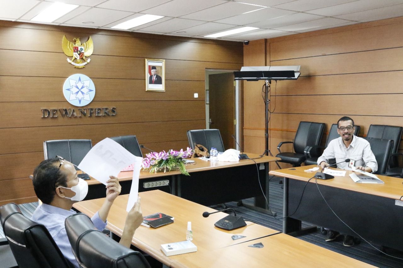 Staf Khusus Ketua DPD RI Bidang Media dan Informasi, Sefdin Syaifudin saat menyampaikan print out berita Koran Tempo 1 Maret 2022 kepada Ketua Komisi Hubungan Antar Lembaga dan Luar Negeri Dewan Pers, Agus Sudibyo di Kantor Dewan Pers, Kebon Sirih Jakarta, 4 Maret 2022.