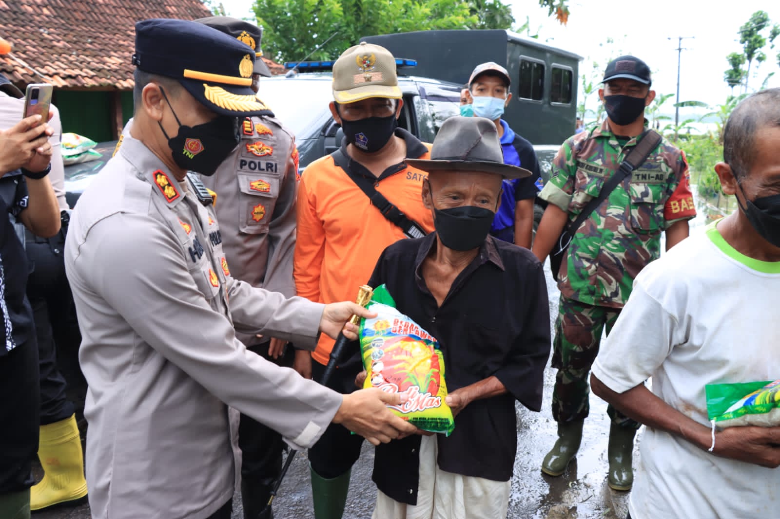 Raut wajah kecemasan akhirnya diwarnai keceriaan saat rombongan jajaran Polres Jember turun, menyapa warga terdampak sembari memberikan bantuan sosial berupa ratusan paket beras yang disalurkan dan diberikan langsung oleh Kapolres Jember.