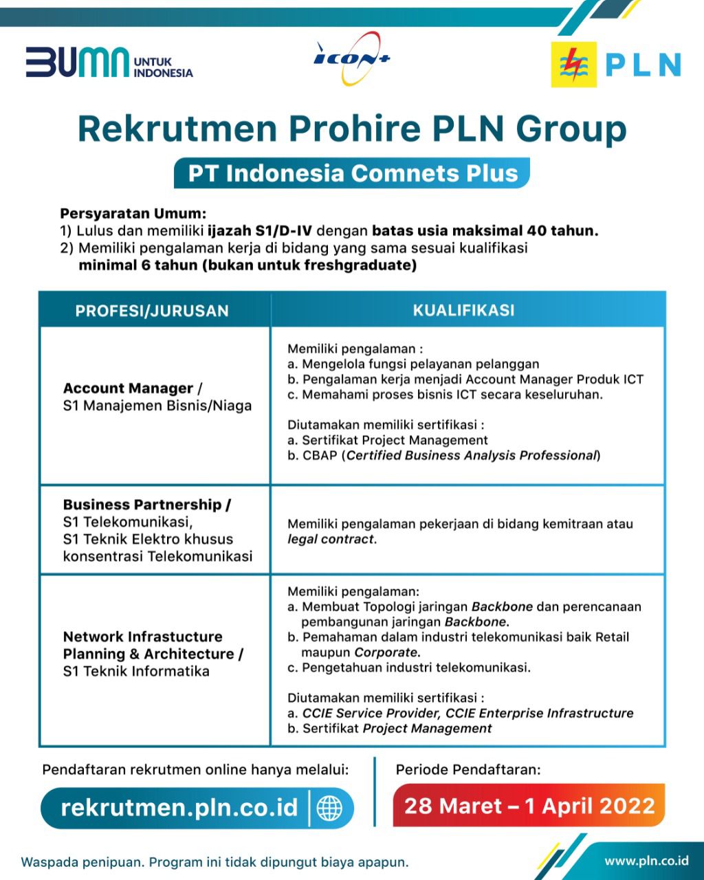 Anak usaha PLN ini saat ini tengah mencari para profesional yang akan ditempatkan sebagai Account Manager, Business Partnership, dan Network Infrastructure Planning & Architecture