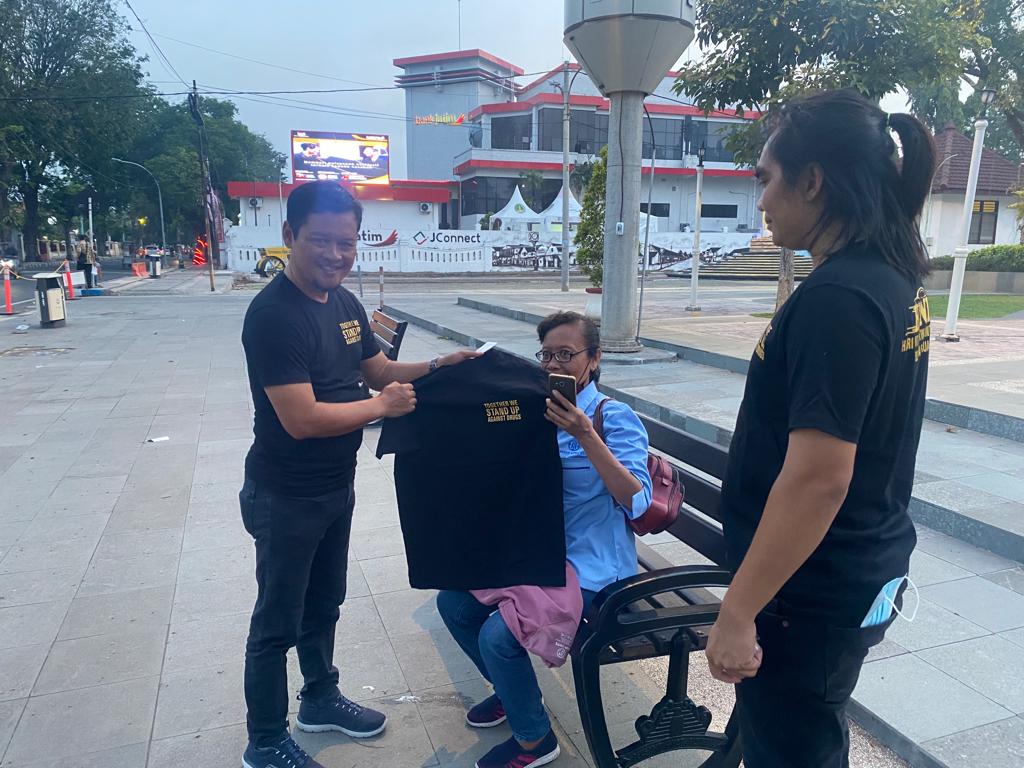“Kami dari Kepolisian mengajak seluruh masyarakat perang melawan narkoba, menuju Indonesia yang bersih Narkoba,”tegas AKP Nanang di sela – sela kegiatannya membagikan pesan melalui kaos gratis.