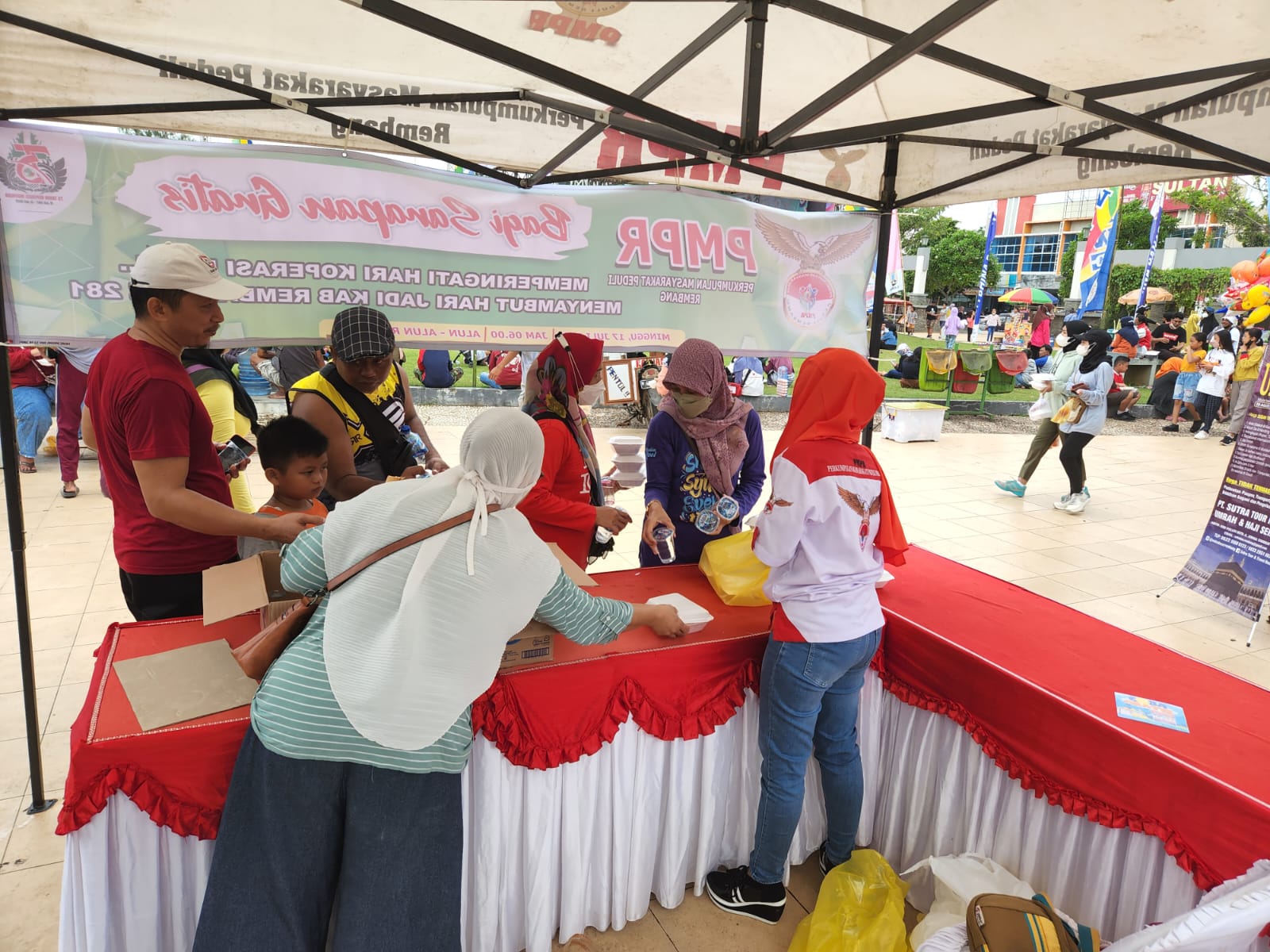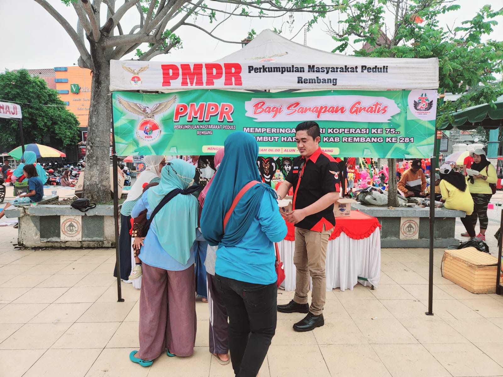Rembang, IPers -Dalam memperingati hari koperasi yang ke-75. Perkumpulan Masyarakat Peduli Rembang (PMPR) ikut berpartisipasi berbagi sarapan gratis, di kabupaten Rembang, kegiatan di laksanakan hari minggu tanggal 17 Juli , bertempat di alun alun kabupaten Rembang.