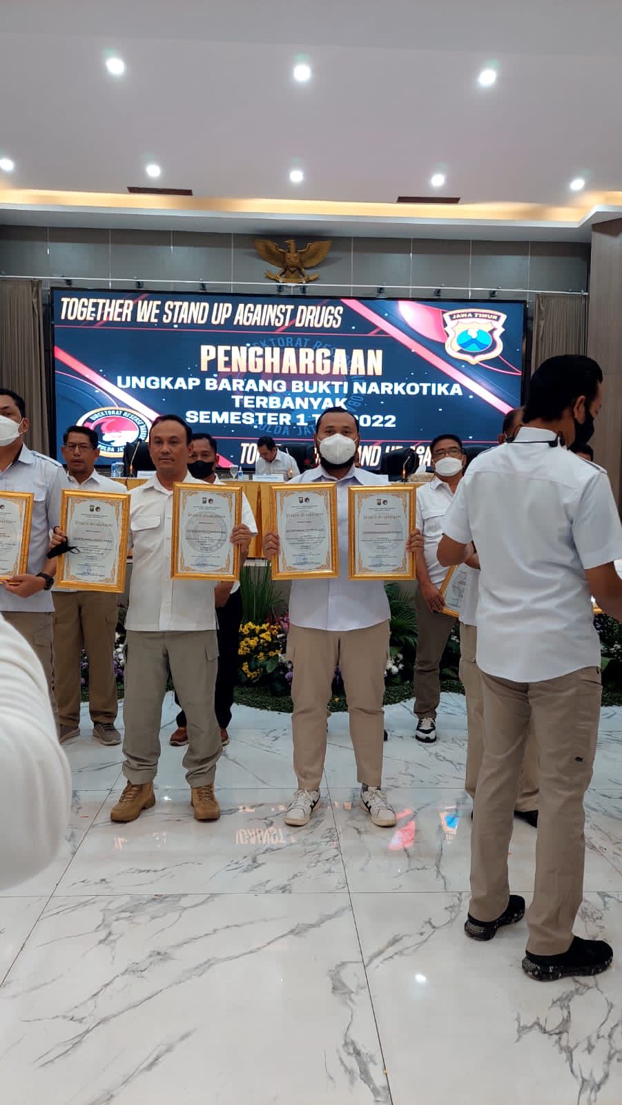 MALANG, IPers - Kapolres Malang AKBP Ferli Hidayat melalui Kasat Reserse Narkoba Polres Malang AKP Harjanto Mukti Eko Utomo menerima penghargaan dari Direktorat Narkoba Polda Jatim sebagai Ranking 1 perihal Ungkap Kasus dan Barang Bukti Narkotika terbesar se Polres Jajaran Polda Jawa Timur Kategori B dalam kurun waktu 6 Bulan Tahun 2022 di Gedung Mahameru Mapolda Jatim, Jalan Jenderal Ahmad Yani, Jemur Wonosari, Kecamatan Wonocolo, Kota Surabaya, Jawa Timur, kemarin Sabtu (23/07/2022).