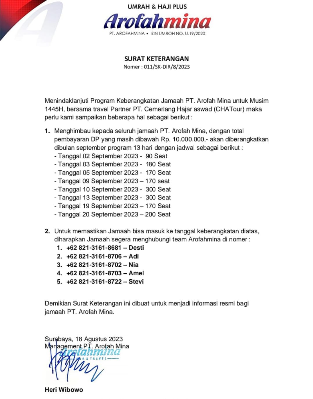 "CHATour Travel partner dari Arofah Mina Travel, menghimbau kepada seluruh jamaah PT. Arofah Mina, dengan total pembayaran DP dibawah Rp. 10 juta akan diberangkatkan di bulan September dengan program 13 hari," jelasnya. Jum'at (18/08/2023)