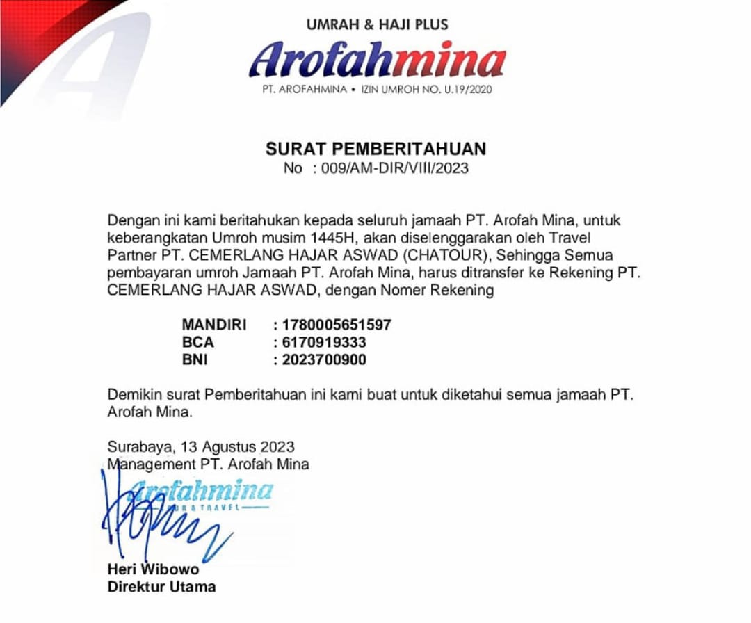 CHATour Travel senantiasa memberikan kemudahan kepada semua jamaah Umroh dan Haji Plus, dengan memberikan pelayanan terbaik. Berdasarkan surat pemberitahuan nomer 009/AM-DIR/VIII/2023, untuk semua jamaah dari PT Arofah Mina melakukan pembayaran kepada PT Cemerlang Hajar Aswad melalui, BCA 6170919333, BNI 2023700900 dan Mandiri 1780005651597.