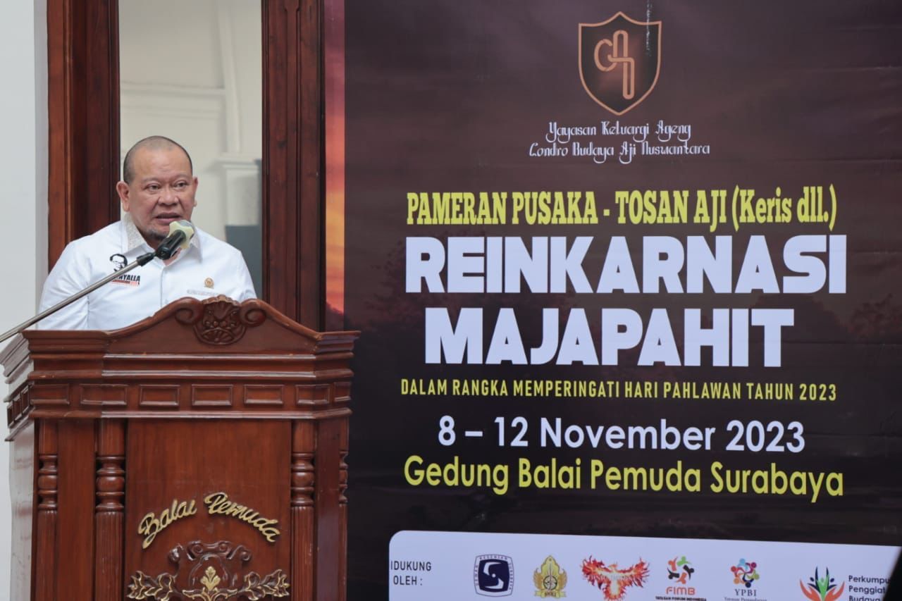 "Tidak sedikit sejarawan yang telah melakukan penelitian dan penulisan tentang keris di Nusantara ini. Dan keberadaan keris di Nusantara dapat dibuktikan secara arkeologis melalui sejumlah prasasti yang ditemukan," kata LaNyalla ketika membuka Pameran Seni Tosan Aji Reinkarnasi Majapahit yang diselenggarakan oleh Yayasan Keluargi Ageng Condro Budaya Aji Nuswantara di Gedung Balai Pemuda Surabaya, Rabu (8/11/2023).
