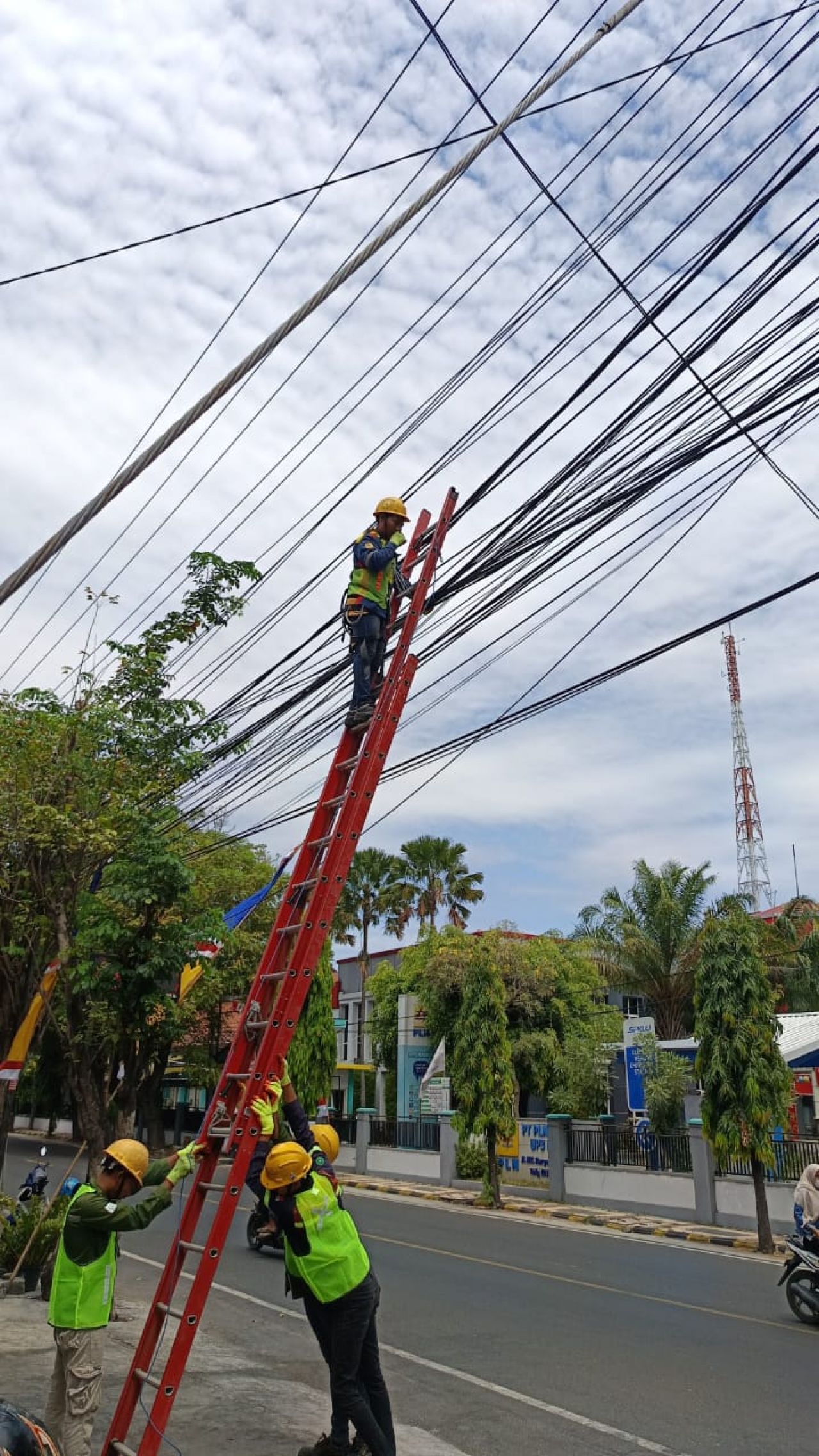 Madiun, IPers - (28/08/2024) - PLN Icon Plus, Subholding Beyond kWh milik PLN, berinisiatif melakukan penataan kabel fiber optic di Tiang rendah (TR) di Kabupaten Madiun pada Rabu (28/08/2024). Tepatnya dilaksanakan di ruas jalan utana MT. Haryono, Madiun di depan Kantor PLN UP3 Madiun.